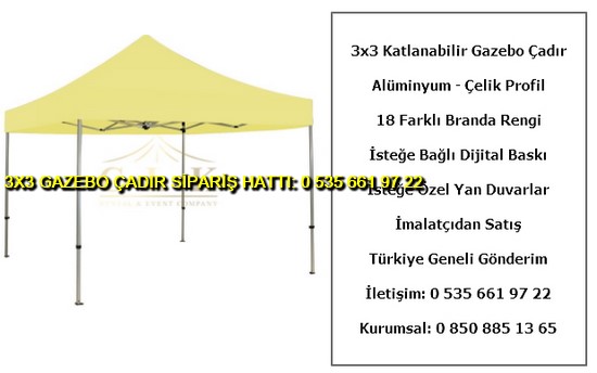 Türkiye geneli 3×3 metre katlanabilir gazebo çadır satışı yapan firmaların asıl tedarikçi ve imalatçı firması olan firmamızdan en uygun ve ucuz fiyatlar ile çadır satın alabilirsiniz. Toptan ve perakende siparişleriniz için ayrı fiyatlar verilmektedir. Bayilik fiyatları satın almak için ay bazında en az 50 ve üzeri çadır siparişi vermeniz gerekmekedir. 1 ve 5 adet arası çadırlarınız perakende olarak değerlendirilir ve piyasanın en uygun fiyatları ile en kaliteli 3×3 gazebo çadır satın alabilirsiniz.